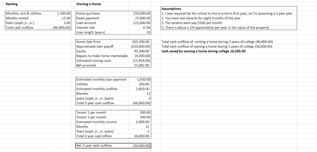 Owning a home as a student in school could save you thousands of dollars down the road. I did this very thing while I was in school. I made these particular assumptions very conservative.